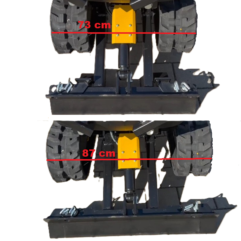 Eine schmale Bauweise und die hydraulisch verstellbare Spurweite (730-870mm) bringen den MB-850 auch durch schmale Tore und Wege sicher zum Einsatzort und bieten dort einen sicheren Stand.